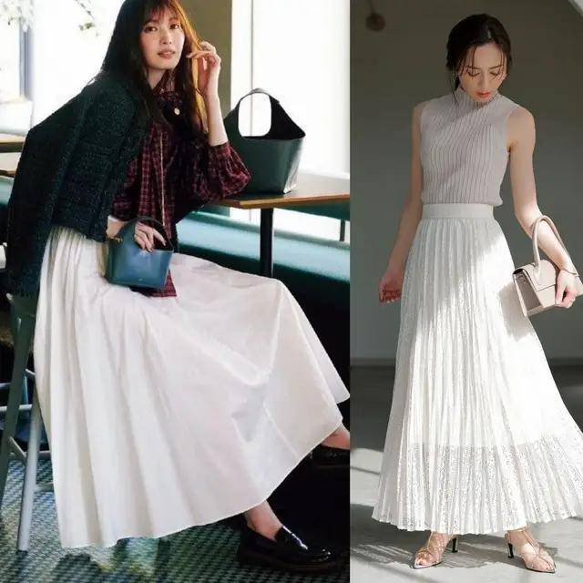 白色伞裙与白色百褶半身裙有着利落挺括的廓形,搭配温柔软糯的针织无袖上衣,或是选择一件黑色的精致小香风外套,即可打造出早春出行的精致优雅、通勤时髦,也能穿出日常的慵懒随性,高级感与贵气自然流露。