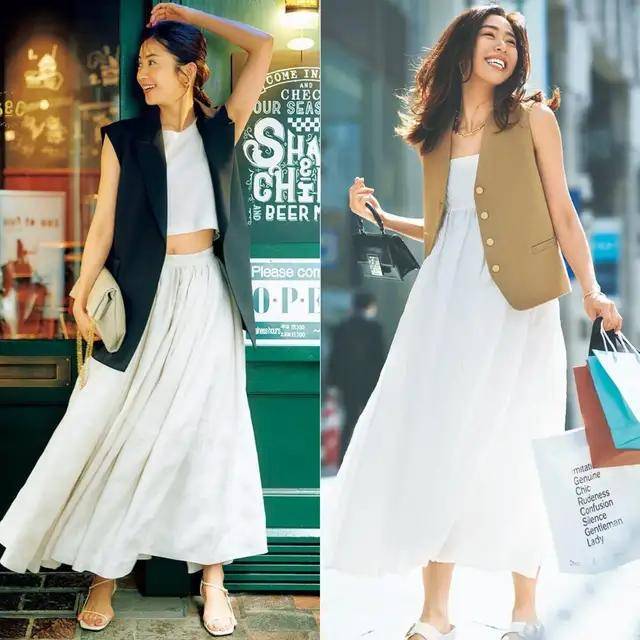 西装马甲搭配白色伞裙或是白色吊带连衣裙,白色向来百搭耐看,谁穿谁好看,不挑身形不挑气质,也是春日最不挑人的裙装色彩,像春风写给时光的情书,怎么看都温柔,怎么穿都不腻。