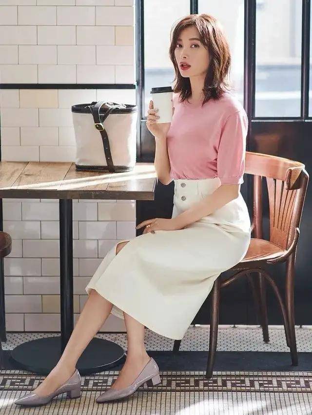 而色彩上尽可以选那些与春日气息相融的清新色调,一件粉色针织短袖配上纯净的白色直筒半身裙。脚踩一双浅紫色的低跟单鞋,温柔又不挑肤色,自带显白显嫩的柔光。