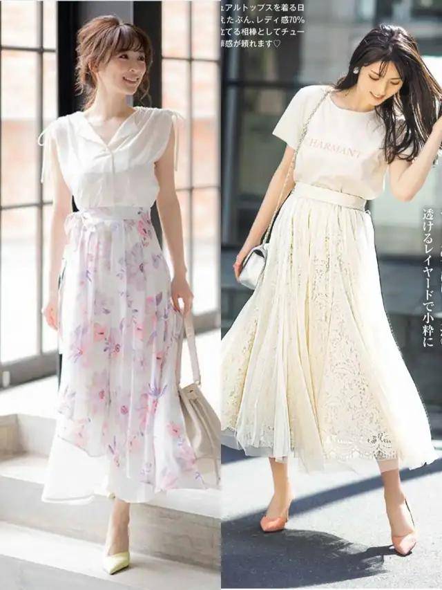 基础的白色 T 恤也能穿出小心机,搭配上一条镂空薄纱半身裙,就能呈现出温柔又有女人味的气质。