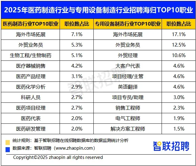在专用设备制造这样的行业中,和海外市场直接相关的岗位,已经占到招聘前十职位的四成以上。