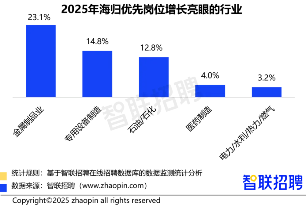 从最新的数据来看,金属制品、专用设备制造、石油化工等技术密集型行业对海归的需求增速明显加快,医药制造、电力和新能源等行业也在持续扩张。