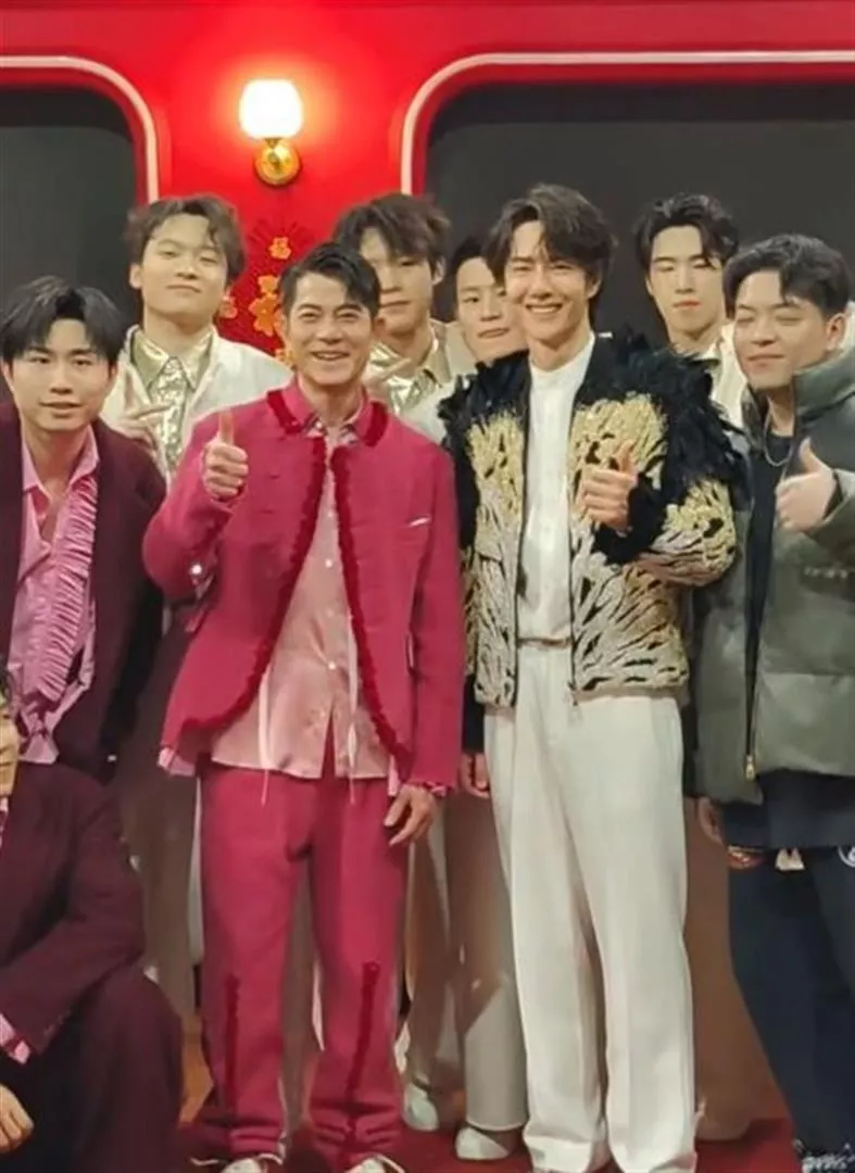 说到舞台,就在这次马场亮相的几天前,郭富城刚刚在2026年央视春晚的舞台上,和年轻偶像王一博合作表演了歌曲《闪耀动起来》。除夕夜,他穿着一身火龙果色的演出服,在台上全开麦唱跳,完成各种高难度动作。整场表演下来,他的气息和舞步依然稳健,被很多观众称赞“业务能力过硬”,“体能完全不输年轻爱豆”。后台合影时,他站在王一博旁边,笑容满面,活力十足,确实像个亲切的大哥哥。