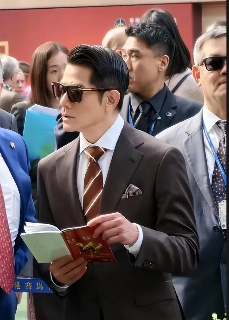 郭富城穿了一身深咖色的笔挺西装,打了同色系的条纹领带,招牌的墨镜和大背头一丝不苟。他站在人群里,身姿挺拔,完全看不出已经踏入了花甲之年。网友拍到的生图里,他头发乌黑浓密,身材紧实,嘴角挂着恰到好处的微笑,随手一拍都像时尚大片。很多人感叹,这状态说是三十多岁都有人信。