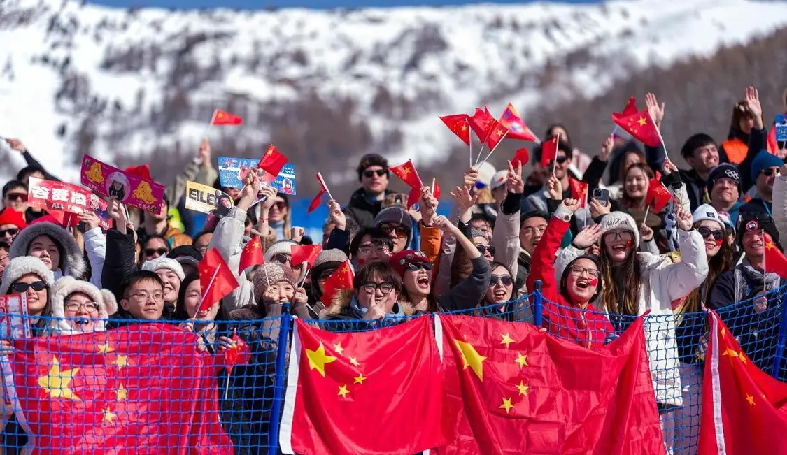2026年米兰冬奥会,利维尼奥的雪场上有个特别热闹的角落——只要谷爱凌一出场,看台上立马炸开了锅,尖叫声此起彼伏。现场到处都能看到五星红旗,特别显眼。粉丝们举着各种应援牌,喊得震天响,声音都快盖过风雪了,成了赛场上最燃的背景音。
