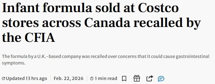 加拿大食品检验局(CFIA)表示,全国各地Costco Wholesale门店销售的一款婴儿配方奶粉因含有cereulide毒素而被召回。