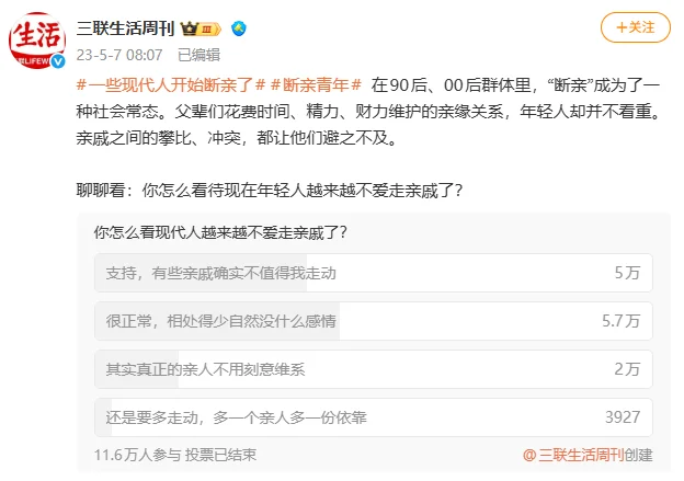 物理距离拉开的不仅是空间,也有共同经历与日常互动中培育的情感。《三联生活周刊》的一项有11.6万人参与的微博投票结果显示,近一般人认为与亲戚日常联系很少,不探亲很正常;另有5万票数认为一些亲戚“不值得探访”。