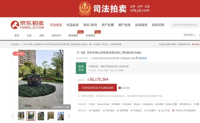 此次拍卖的深圳市南山区恒裕滨城花园二期3座A单元40A房起拍价5617.5364万元,保证金600万元。京东网络询价报告显示,深圳市南山区恒裕滨城花园二期3座总楼层46层,拍卖标的位于40层,朝向东南,户型为4室2厅2卫,单价为17.8499万元,总价4082.6226万元;网络络询价结果有效期至:2022年04月27日 。阿里网络询价报告显示,深圳市南山区恒裕滨城花园二期3座A单元40A房单价为29.4296万元,财产参考总价为6731.1381万元。工商银行网络询价报告显示,该标的物单位面积价格26.4028元,参考财产价格6038.8484万元 。