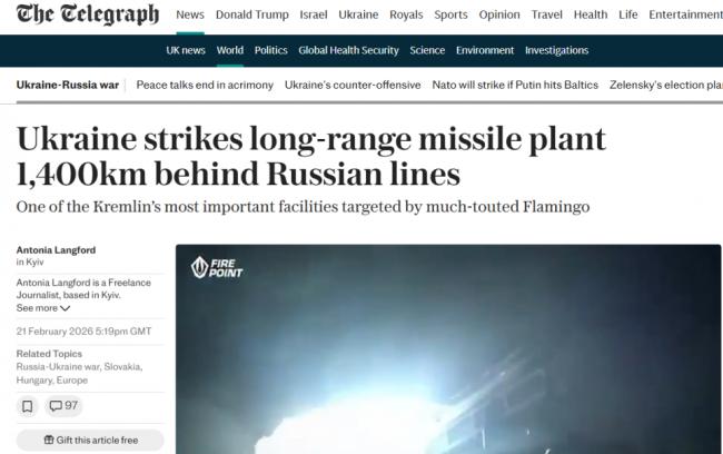 《每日电讯报》报道称,乌克兰军队当天成功袭击了一家生产最先进弹道导弹系统的莫斯科军事工厂。乌克兰总参谋部在一份声明中表示,周六,地面发射的FP-5“火烈鸟”巡航导弹被用来打击位于俄罗斯乌德穆尔特共和国的沃特金斯克机械制造厂。该厂距离俄乌边境超过1400公里,是俄罗斯生产固体燃料弹道导弹最重要的设施之一。