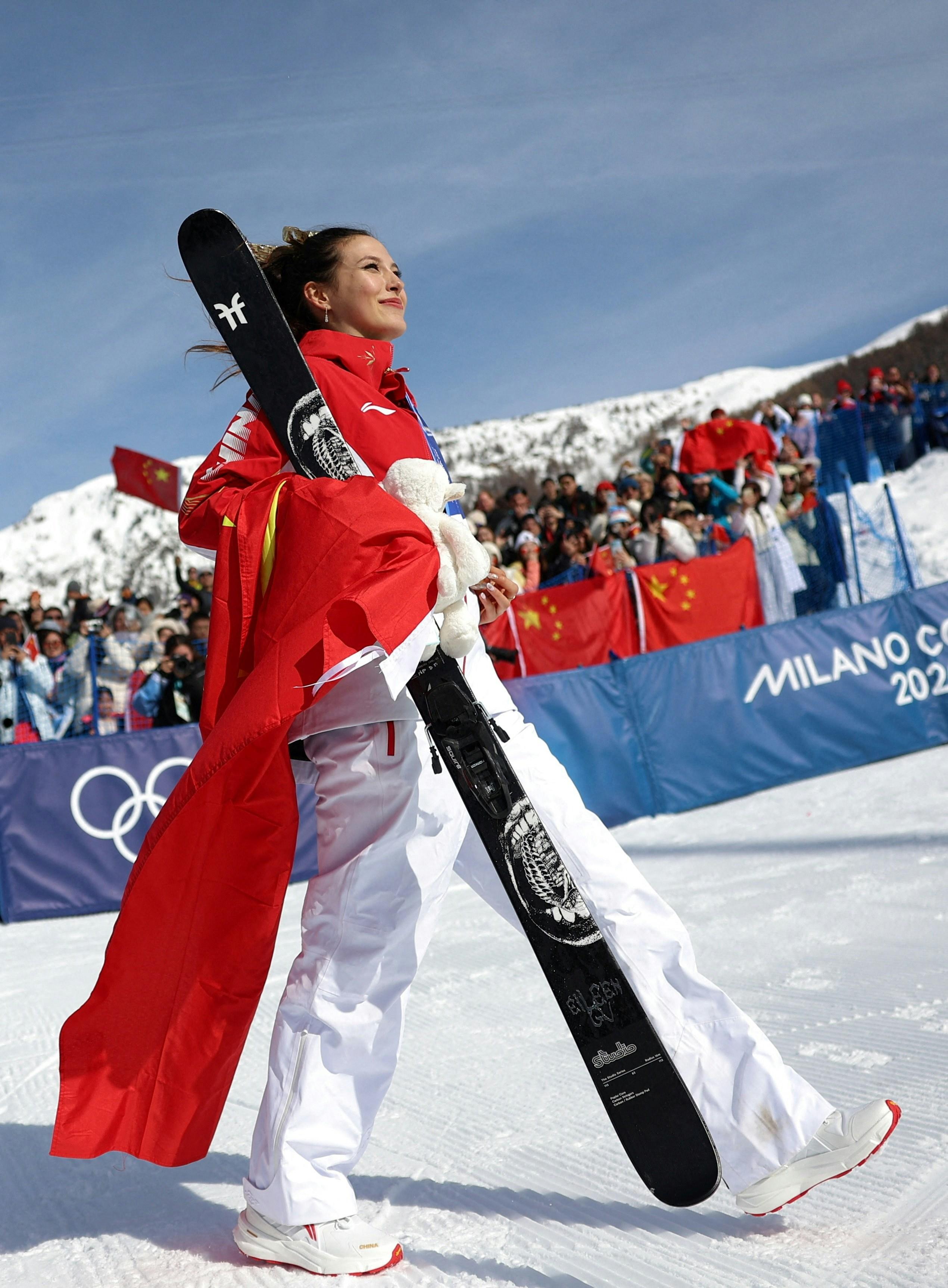 图为2026年2月22日,谷爱凌在米兰冬奥出战女子自由滑雪冠军。(Reuters)