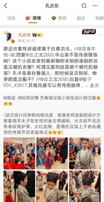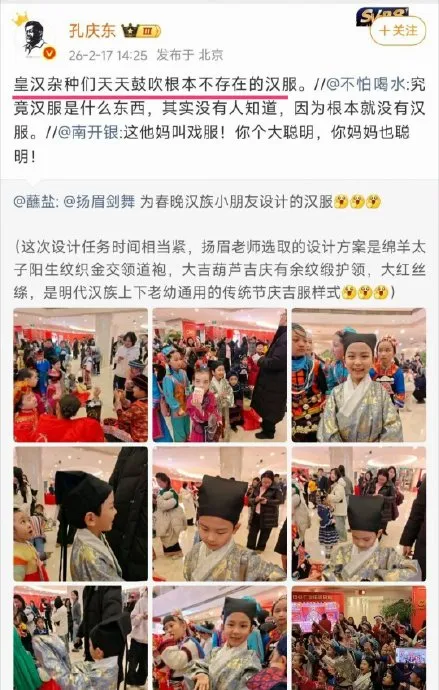 然而,北大教授孔庆东却坐不住了,他在社交媒体上火力全开,不仅称“汉服根本不存在”,更将穿汉服的孩子们和支持者骂作“皇汉杂种”、“人渣中的渣”、“衣冠禽兽” 。