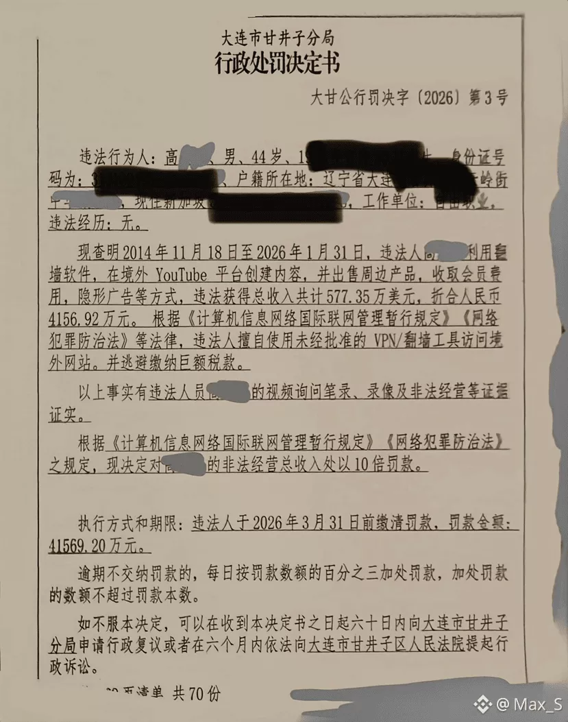 近日各大社群疯传一张“行政处罚决定书”截图,老高因多年使用翻墙软件制作影片并逃避缴纳税金,被大连警方处以10倍罚款。根据截图,大连警方认定老高与小茉2014年至2026年靠着创建YouTube频道、出售周边商品等方式,违法收入高达577.35万美元,并擅自使用未经批准的VPN翻墙工具访问境外网站,逃避缴纳巨额税款。