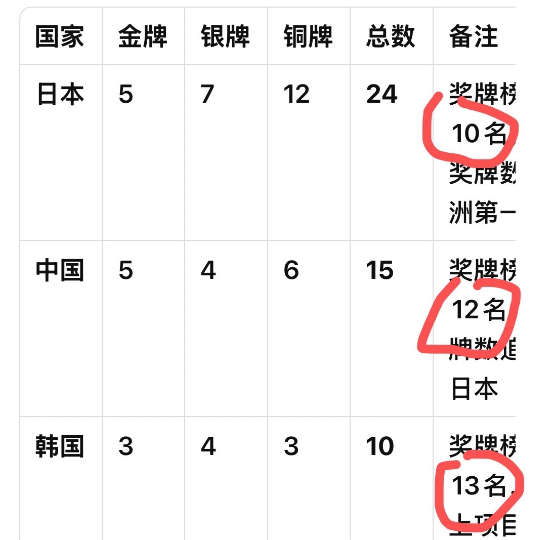 这图是按奖牌总数的排列,如果按金牌,中国在历届总数上就超越日本了: