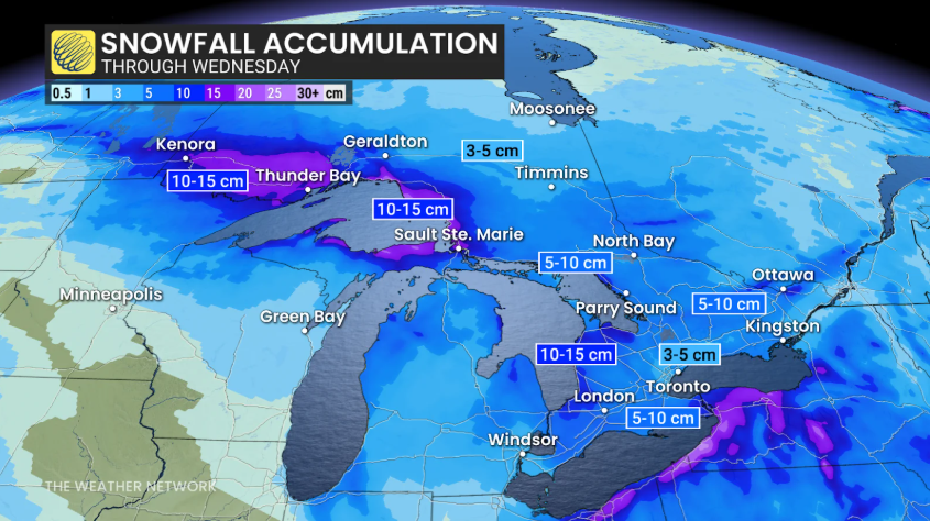 该系统将在周二上午到下午继续向东推进,影响安省北部大部分地区。北岸公路通往Sault Ste. Marie一带,预计将有10至15厘米的降雪。值得一提的是,Sault Ste. Marie本季累计降雪已超过400厘米。到了周二晚间,这股系统将抵达安省南部。晚饭后的通勤高峰时段,GTA地区可能会迎来大雪,同时伴随时速50至60公里的阵风。随着系统东移进入魁北克省,周三仍会有零星小雪持续。不过,由于湖效应降雪(lake-effect snow),部分“雪带”地区的降雪量可能更高。整体来看,到周三结束前,安省南部普遍预计会有5至10厘米的降雪。