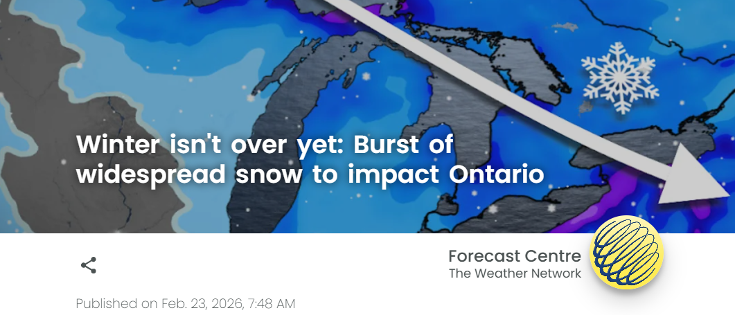气象专家还提前关注本周后半段的天气走势。届时,一个在美国境内发展的低压系统,可能会给安省南部部分地区——包括GTA——再添一波降雪影响。