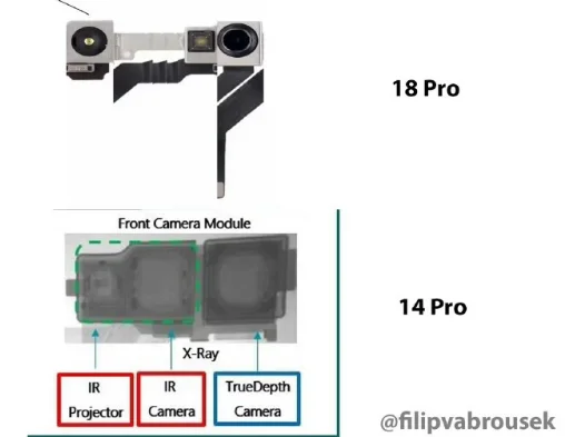 用于暗光补充红外线的红外泛光感应元件挪到左侧,而前置摄像头、点阵投影器以及红外镜头仍然居中。