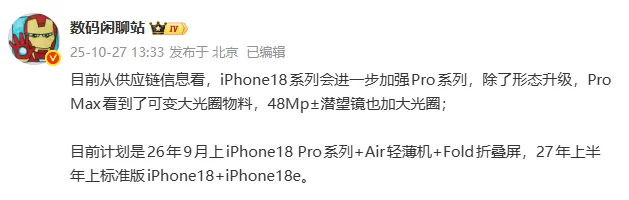 iPhone 18和iPhone 18e,则延后到2027年上半年发布。