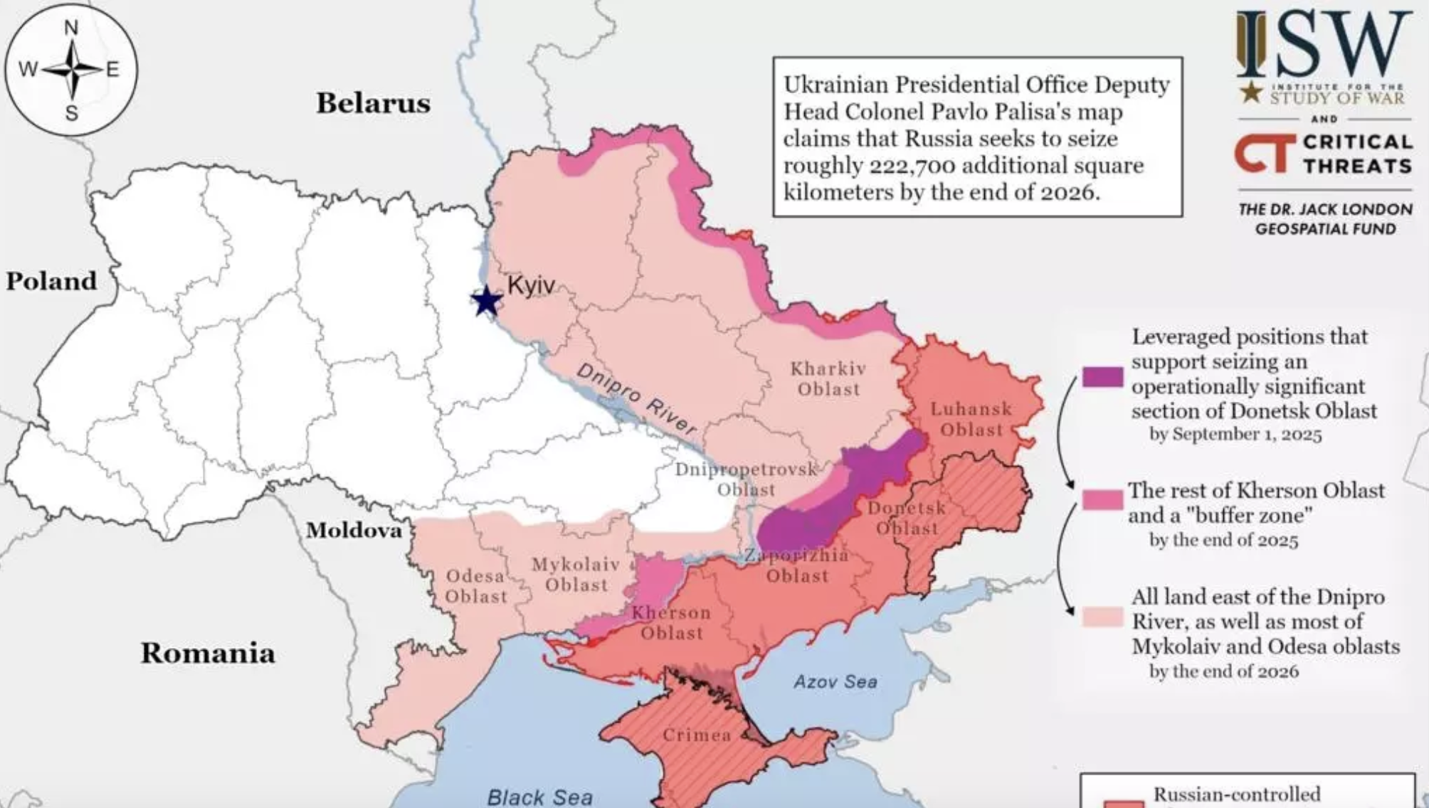 乌克兰对俄罗斯到2026年底的预期目标进行了评估。重点关注被占区、第聂伯河以东的预期推进以及计划向南部和东部地区扩张。 © ISW制图