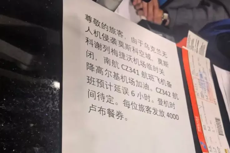 《极目新闻》23日报道,莫斯科一个机场内的通知显示,由于乌克兰无人机侵袭莫斯科空域,莫斯科谢列梅捷沃机场临时关闭,南航CZ341航班飞机备降高尔基机场加油。CZ342航班预计延误6小时。
