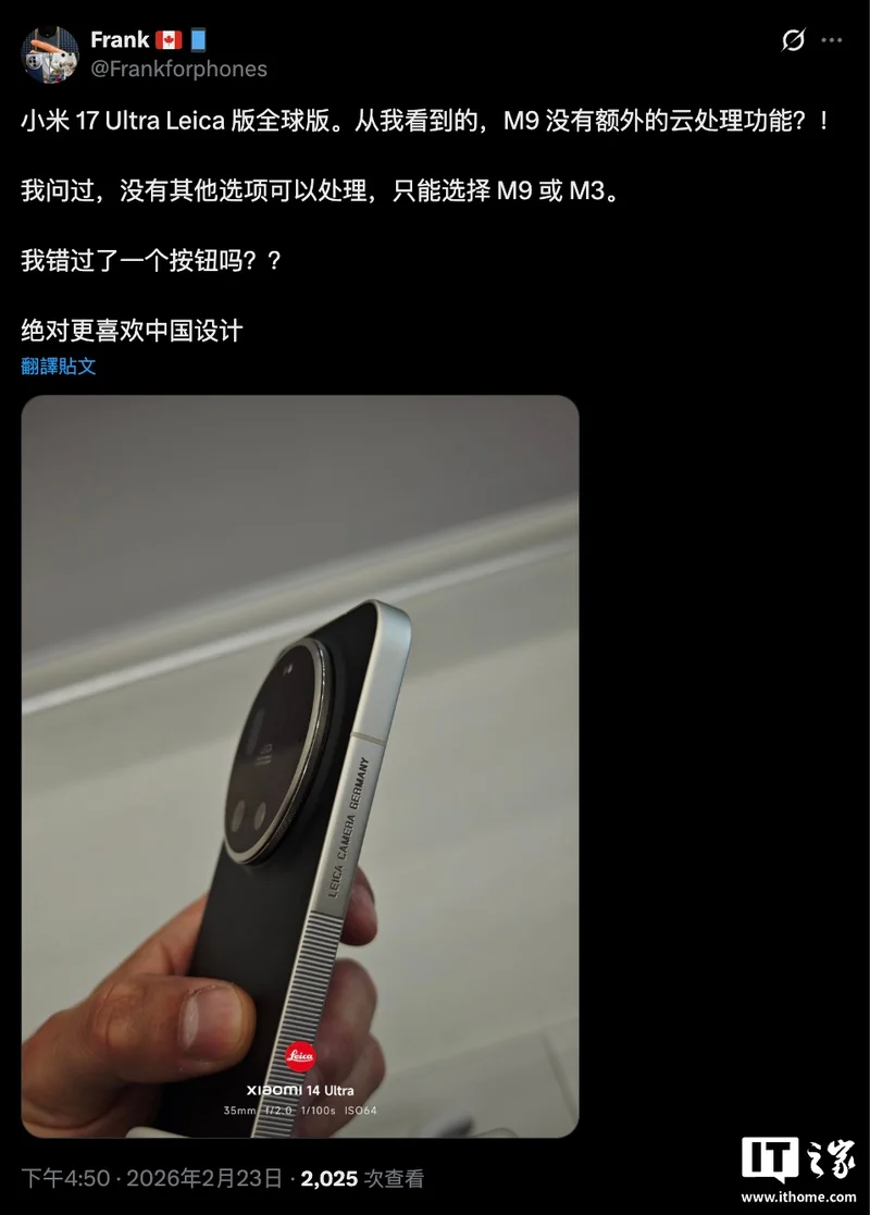 消息源 Frank 今天在 X 平台发文,分享小米 17 Ultra 海外徕卡版“LEITZPHONE”的实拍照片。
