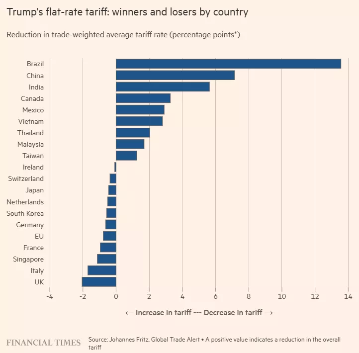 美国总统川普推出新的“全球统一关税”方案,并将税率定为15%。独立贸易监测机构的数据显示,在这一新关税框架下,川普此前多次公开点名、言辞严厉批评的国家——包括中国与巴西——反而成为平均关税下降幅度最大的受益者之一;而英国、欧盟、日本等美国长期盟友则将承受更明显的税负上行压力。