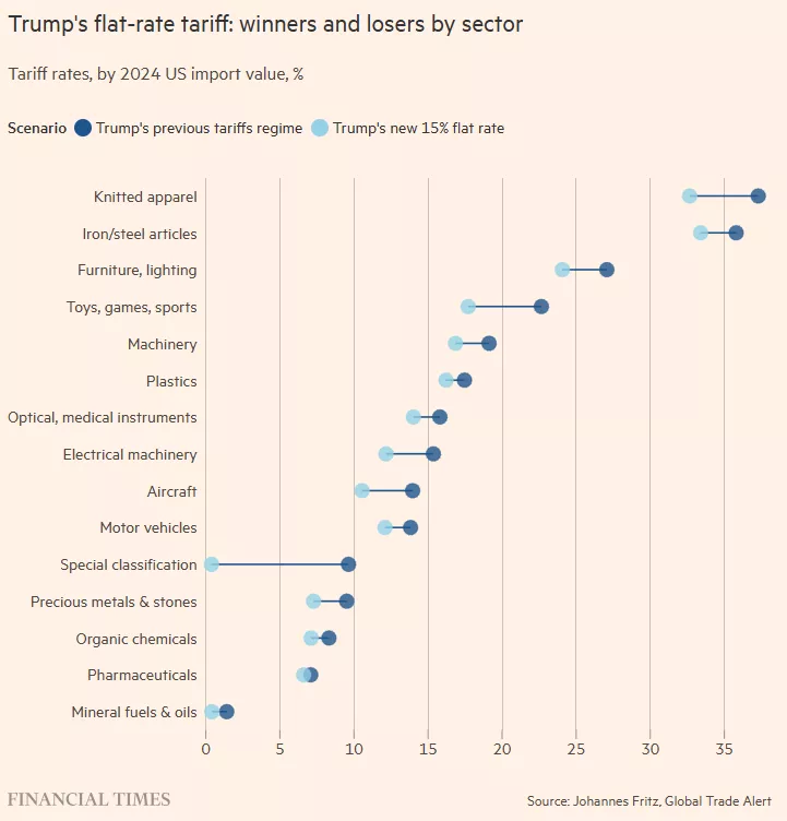 GTA测算显示,英国可能成为新制度下的最大受损方:此前英国在许多商品上争取到10%的关税水平,但在统一15%新税率下,其平均关税将上升约2.1个百分点。欧盟方面,尽管其在与华盛顿的安排中获得15%的税率框架,但综合测算仍可能上升约0.8个百分点;在纳入约1100个豁免产品类别后,意大利与法国的暴露程度更高。