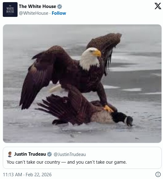 周日,美国队以2比1加时击败加拿大后不久,白宫官方X账号发布了一张图片:一只秃鹰得意地站立着,爪子踩在一只无助地躺在冰面上的加拿大鹅身上。这两种鸟分别是美加两国的象征。