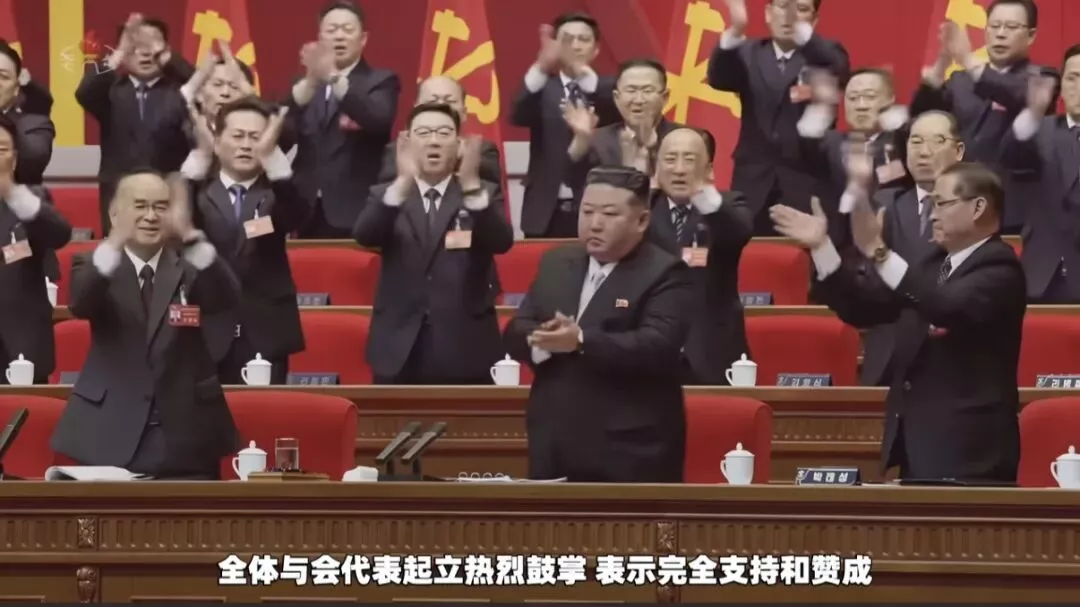 从现场画面可以看到,与代表们热烈兴奋的神态不同,金正恩同志的表情相当严肃,可以看出来是勉为其难,无奈接受拥戴。