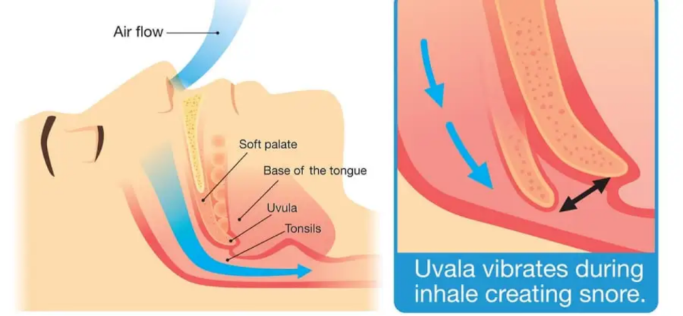 通过图片我们可以看到,正常睡眠时的呼吸是通畅的,而当人体呼吸道周围的肌肉变得松弛,或者是生理结构异常,就会导致呼吸道变窄甚至塌陷堵塞,氧气不能顺利通过呼吸道进入肺部,而且在变窄的气道里加速流动,同时冲击气道里的软组织,就会出现打鼾的现象。