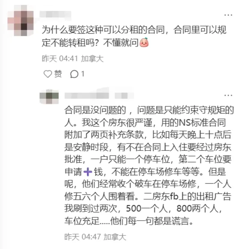 他透露,房东使用的是NS省标准租约,还额外附加两页补充条款,明确规定晚上10点后为安静时段,租客朋友入住需经批准,一户仅限一个车位,第二个需申请并付费,禁止在停车场修车。条款写得清清楚楚,但“省钱”和“套利”面前,对方“压根不当回事”。