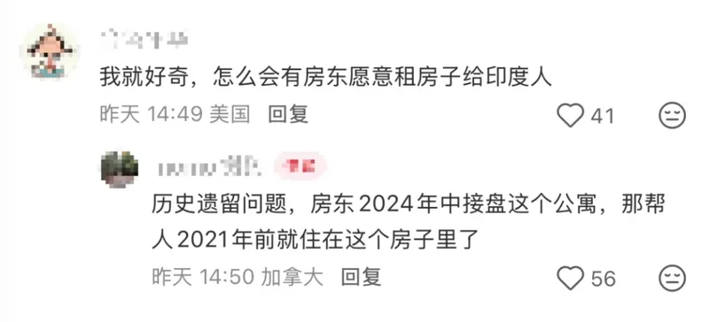 还有网友问,房东为何当初会租给印度人?发帖人解释,这属于历史遗留问题,房东想赶却赶不走。现在的房东是2024年中才接手公寓,而这群租客早在2021年之前就已入住。根据各省住宅租赁法规,合法租约下要驱逐租客并非易事,尤其涉及长期租约,程序复杂且耗时漫长,新房东即便发现问题,也往往束手束脚。