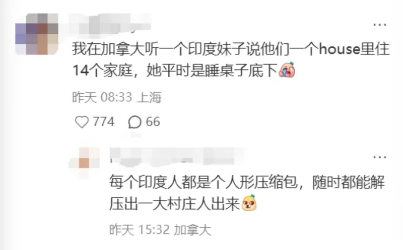 这则爆料引发大量网友共鸣,评论区几乎成了“群租见闻录”。有网友称认识一位印度女生,住在一间House里,“14个家庭挤在一起,她平时睡桌子底下。”也有人调侃:“每个印度人都是人形压缩包,随时能解压出一大村庄人来。”