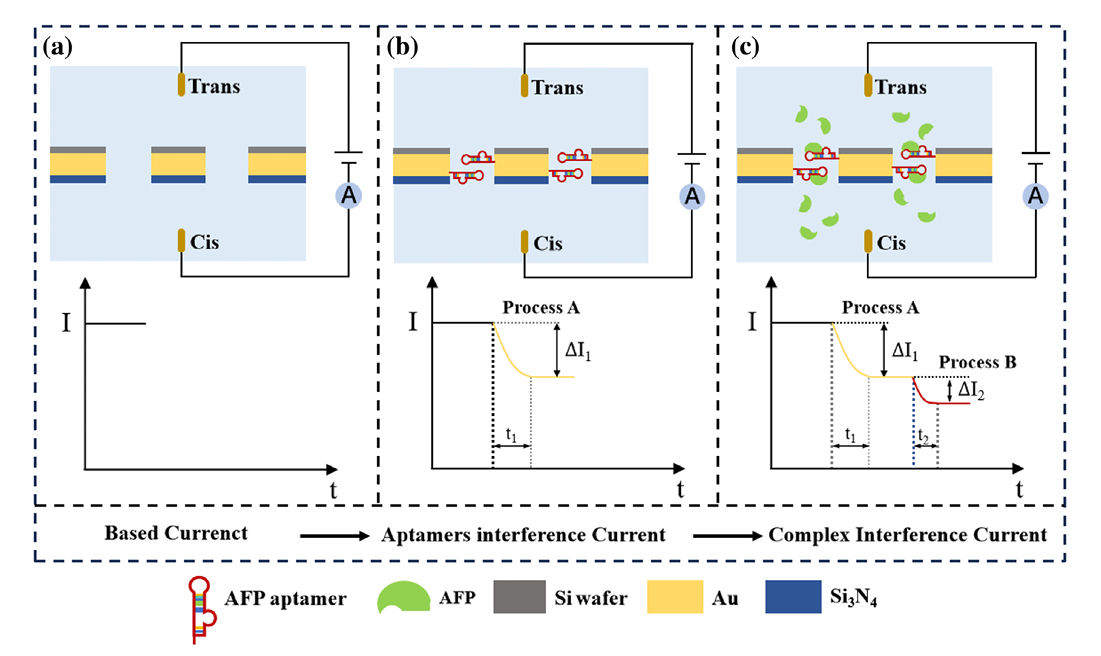Al2O3/Au/Si3N4纳米孔三明治阵列芯片AFP定量检测原理图。研究团队供图,下同
