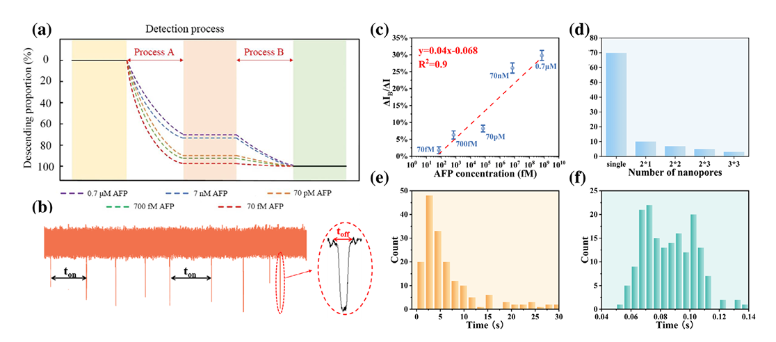 针对上述科学难题,研究人员开展纳米孔阵列结构设计与可控制造研究。提出Al2O3/Au/Si3N4纳米孔三明治阵列芯片,利用该纳米孔三明治结构中的Al2O3、Au、Si3N4与抗体官能团之间结合力的差别实现抗体修饰位置主动精准控制,进而解决抗体修饰位置问题。通过MEMS工艺与氦离子束极端制造方方法,实现Al2O3/Au/Si3N4纳米孔三明治阵列芯片可控制造,并在此基础上实现了fM级甲胎蛋白AFP 的精确检测。