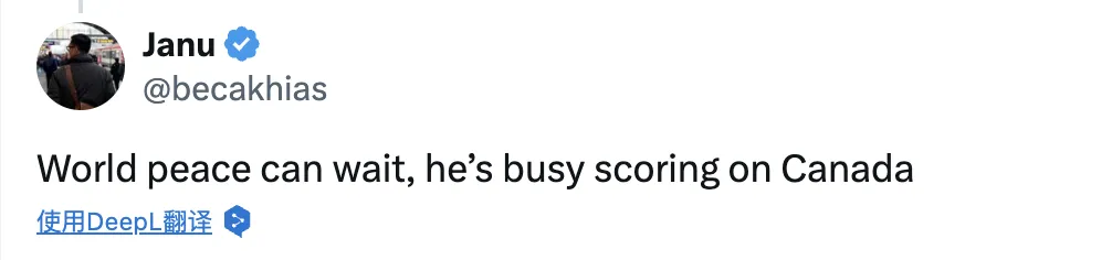 有网友说,“世界和平可以等等,他正忙着对加拿大进球呢。”