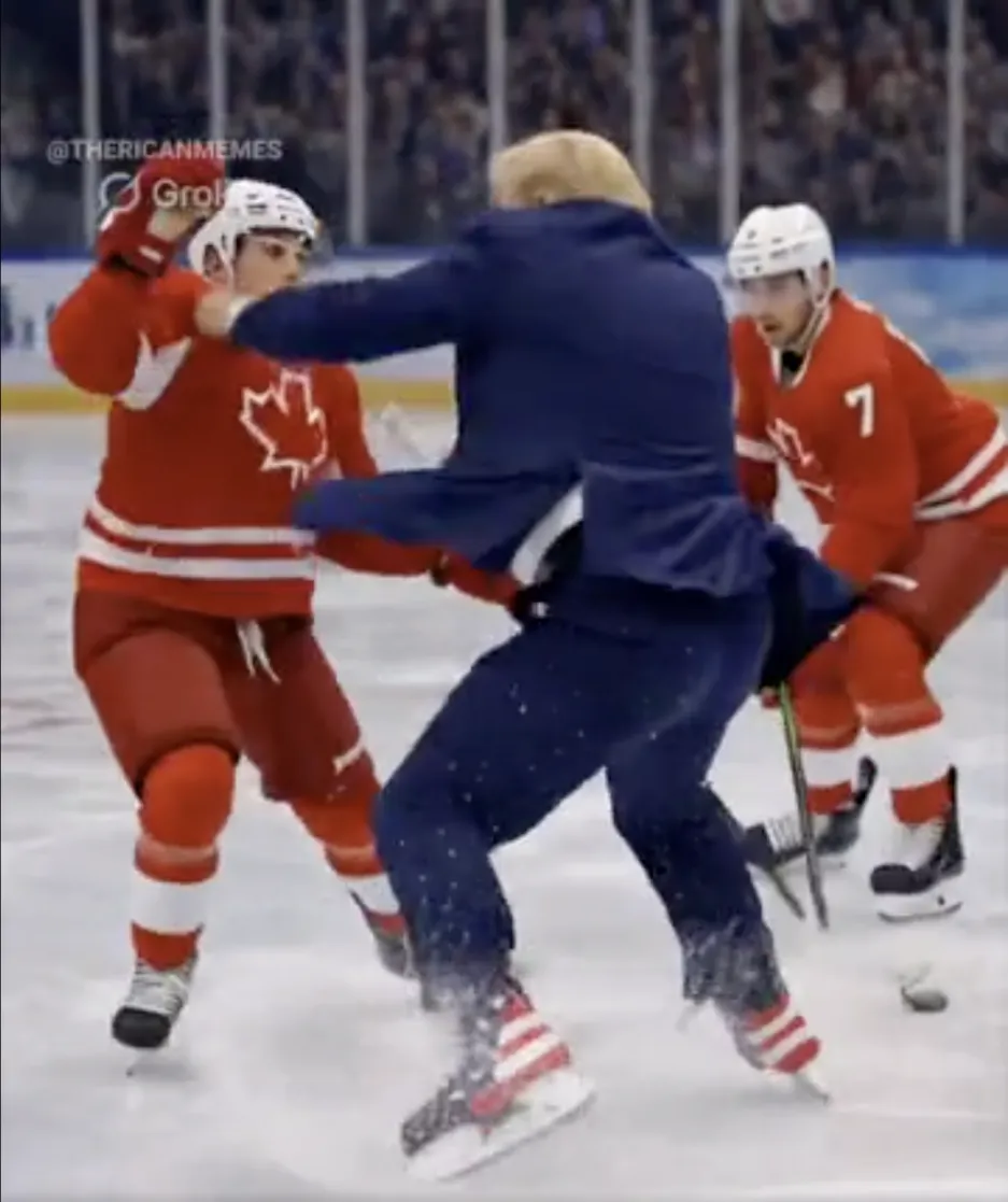 视频显示,比赛进行到一半时,特朗普脱下手套,并赤手空拳殴打加拿大运动员。比赛最后,特朗普再次进球,有外媒形容此举为“一举拿下加拿大”。