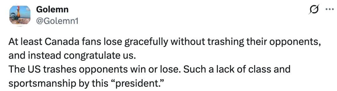 有网友说,“至少加拿大球迷输球后会体面地接受,不会贬低对手,反而会祝贺我们。而美国无论输赢都会贬低对手。这位‘总统’真是缺乏风度和体育精神。”