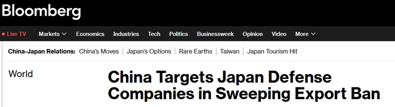 中国将包括三菱重工(Mitsubishi Heavy Industries)旗下关联公司在内的20家日本实体列入黑名单。彭博社指出,在日本首相高市早苗(Sanae Takaichi)赢得选举后,此举加剧了亚洲两大经济体之间的争端。