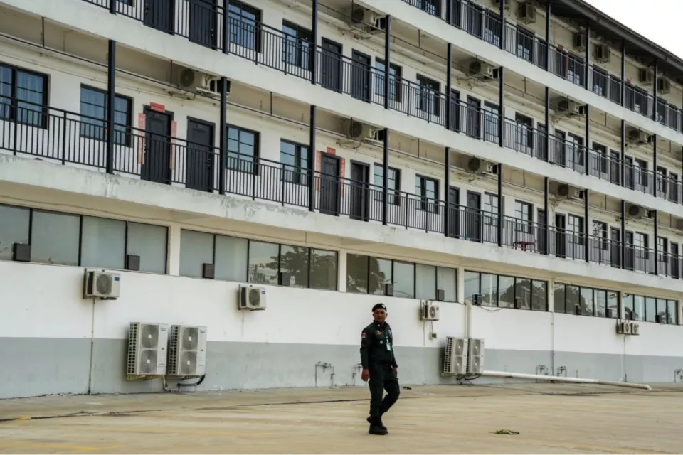 靠岸后,另一辆车已在等候。夜色中,车辆穿过一片灯火密集区域,高墙、铁门、监控摄像头接连出现,入口处站着持枪保安。这里就是诈骗园区。