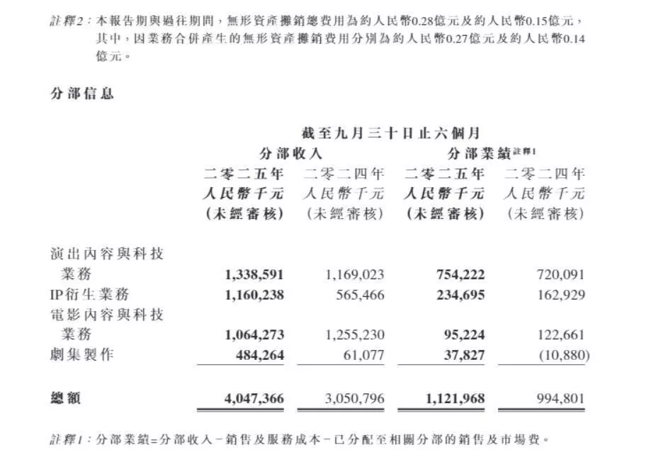 2025年3月至9月,大麦娱乐演出内容与科技业务、IP衍生业务、电影内容与科技业务、剧集制作收入分别为13.4亿、11.6亿、10.6亿和0.5亿元。从财报来看,大麦娱乐最主要的收入来源并非电影,而是演出售票与IP衍生业务。