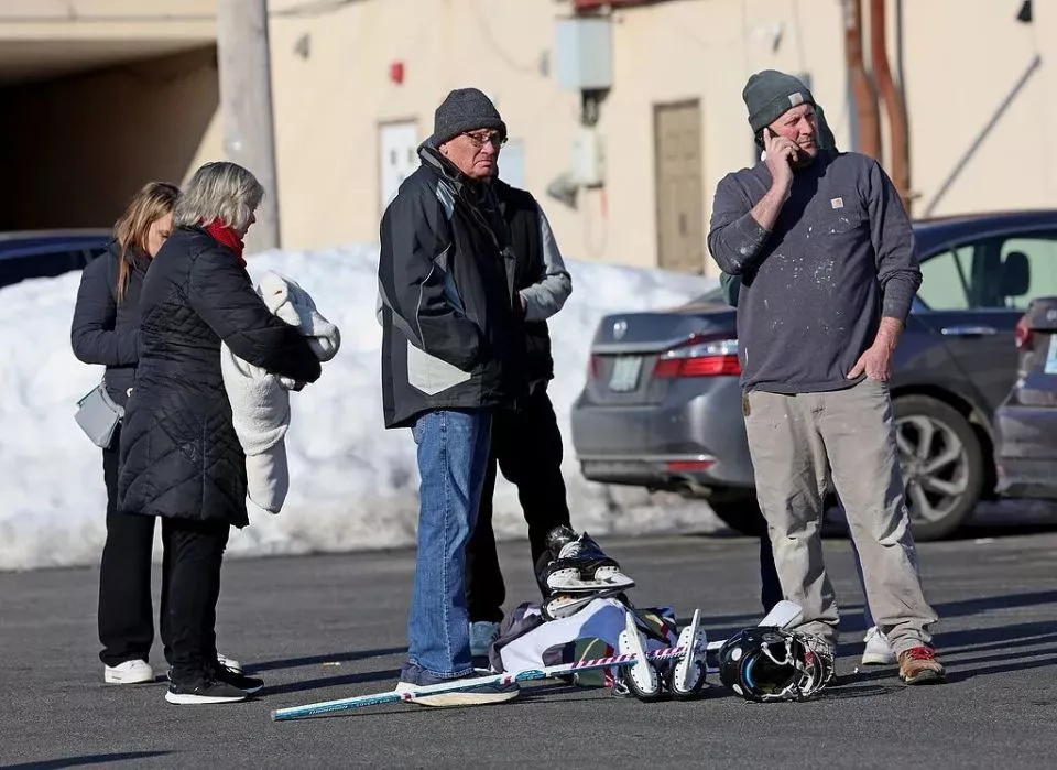 当地时间2026年2月16日,美国罗得岛州波塔基特,冰球场枪击事件发生后,运动员家长聚集在林奇竞技场附近。图/视觉中国