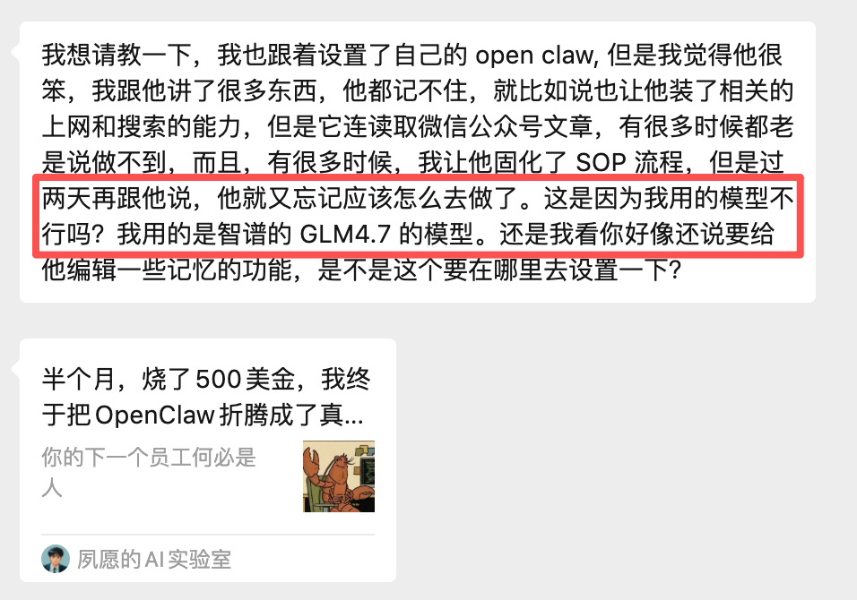 而且国产模型效果是真不够用。我的群友给我反馈说:配好了小龙虾,工具装了,SOP也给了。但过两天跟失忆一样,之前配的东西全忘了。一问,果然,用的国产模型。