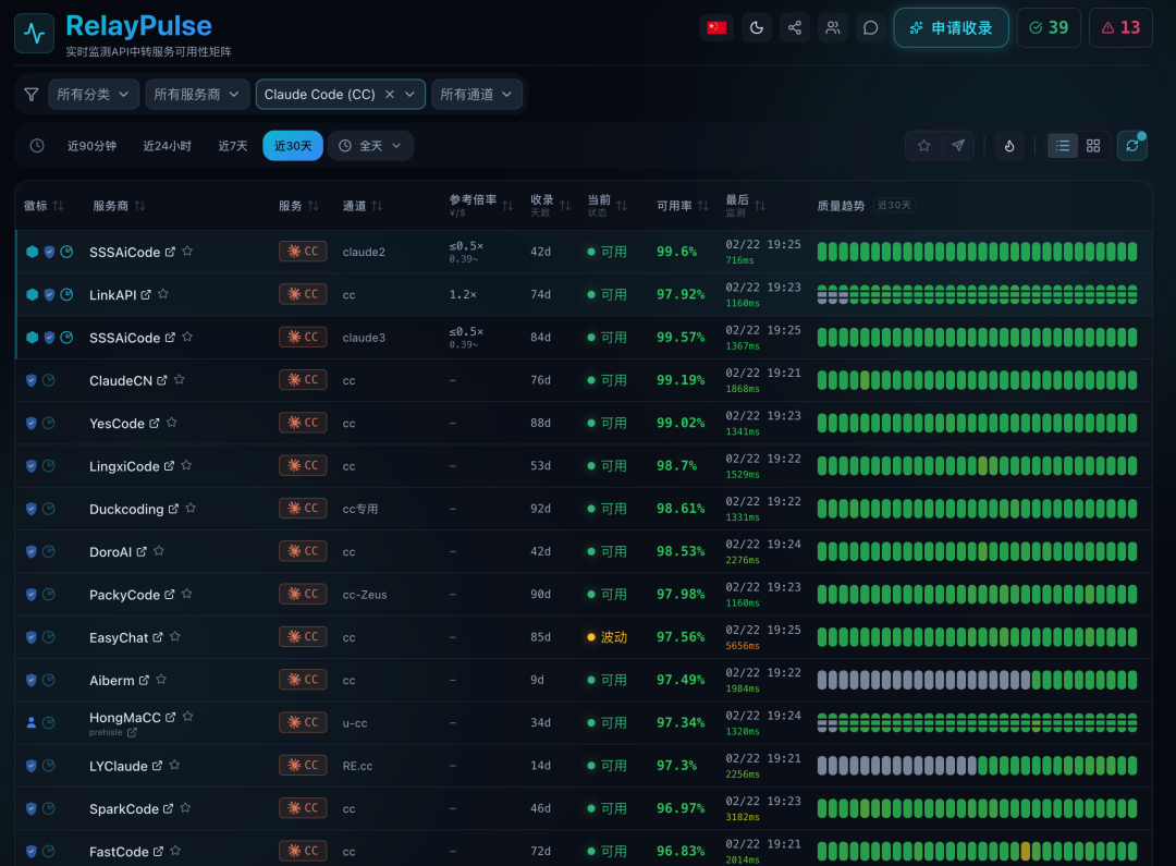 打开RelayPulse(relaypulse.top),这家相当于中转站的「大众点评」,通过云服务24小时全天候检测不同中转站的可用率、稳定性,且不含广。选一家稳定的注册就行。具体哪家我就不推荐来,万一哪天我推荐的跑路了就尴尬了。
