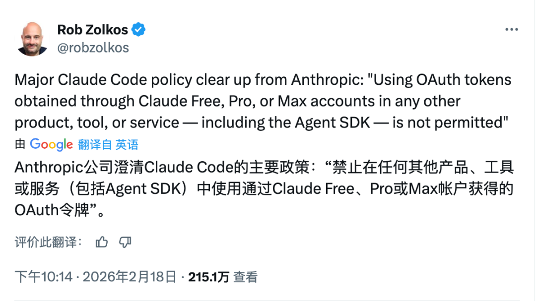 先说一下为什么非得用Claude的API。Anthropic最近发了声明,禁止订阅用户把账号接到第三方软件里,哪怕是自家的Claude SDK都不行。