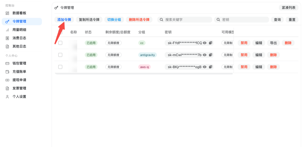 点「令牌管理」→「添加令牌」。
