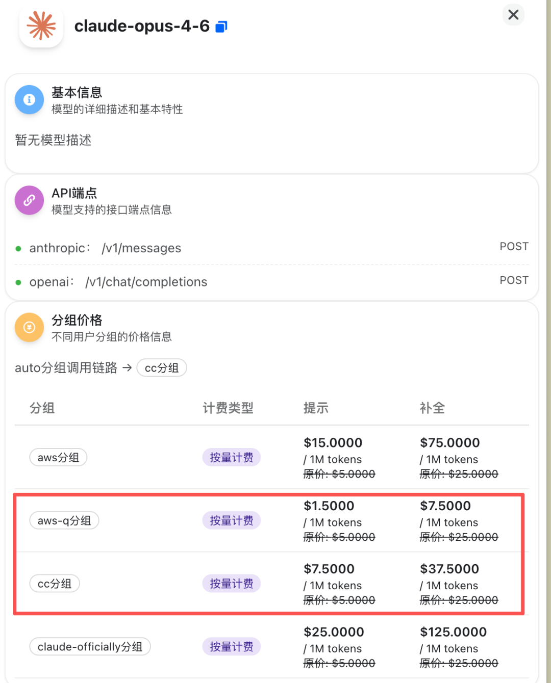 登录后进「模型广场」,找Claude 4.6 Opus,看价格和渠道。以我截图的这家为例,Kiro渠道0.3人民币 = 1美金,Claude Code逆向渠道1.5人民币 = 1美金。