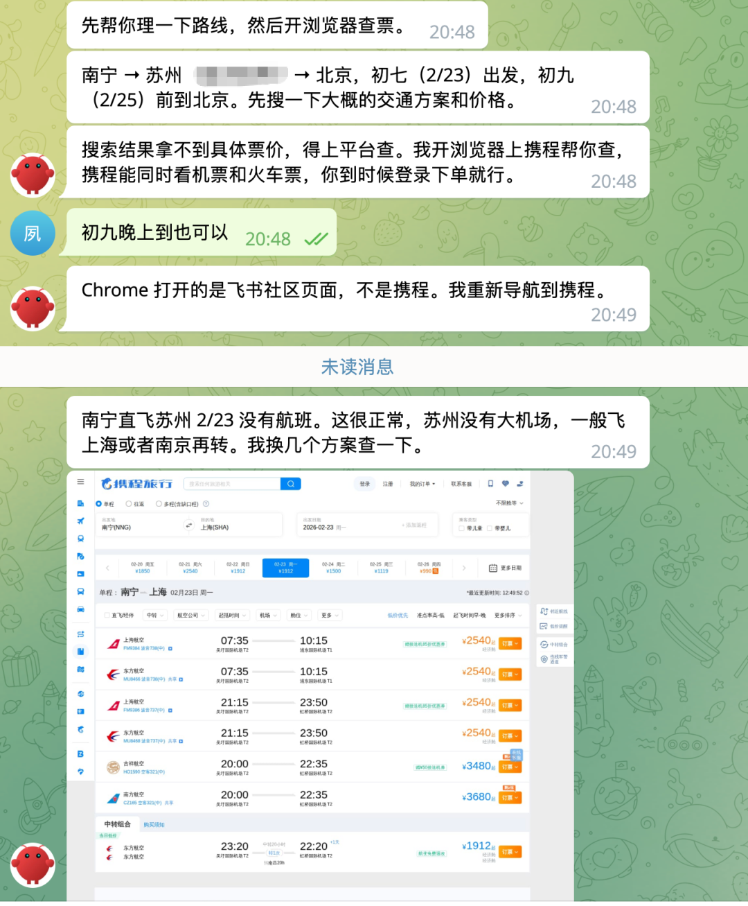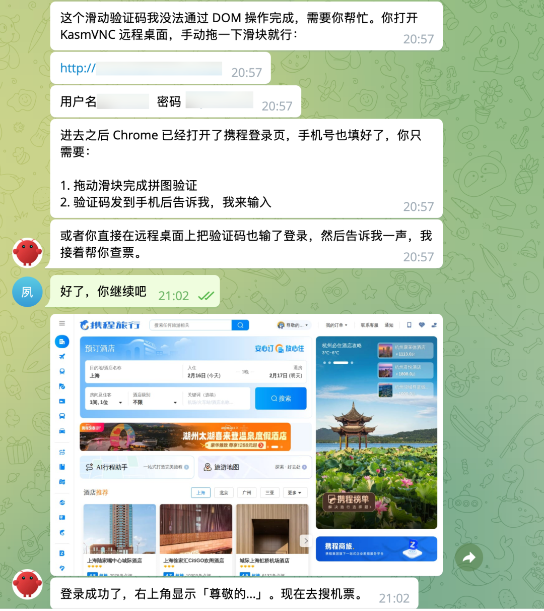 按照我这篇文章:半个月,烧了500美金,我终于把OpenClaw折腾成了真干活的AI员工,配置好的小龙虾加上Claude模型能做到什么呢?举个例子,我想让它帮我买过年返程票,它自己打开了携程,然后让我帮它登一个号。