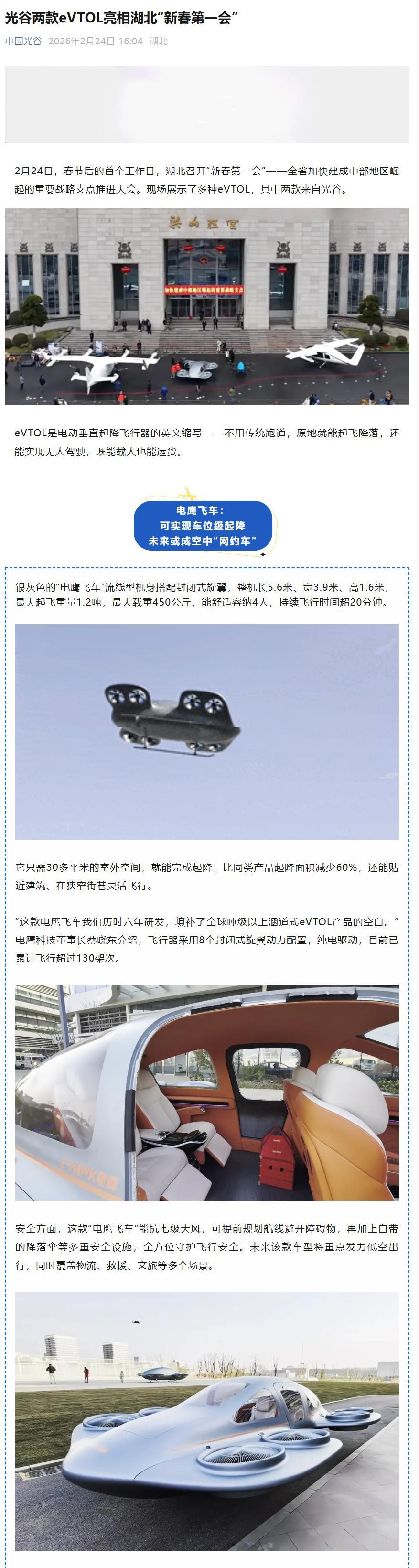 IT之家 2 月 24 日消息,综合湖北日报、光谷融媒体中心报道,湖北今日召开“新春第一会”—— 全省加快建成中部地区崛起的重要战略支点推进大会,现场展示了多种 eVTOL 电动垂直起降飞行器。
