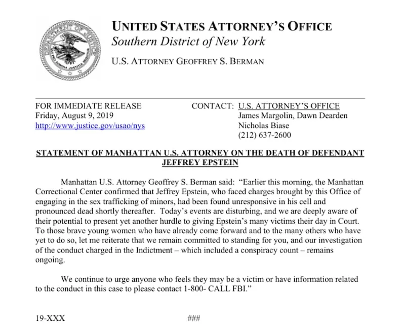 图为关于爱泼斯坦死亡的声明草稿截图。 图源:《野兽日报》报道配图