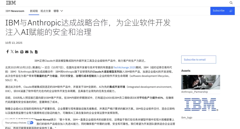 2025 年 10 月,两家公司曾宣布战略合作,把 Claude 集成进 IBM 的开发工具体系,内部有超过 6000 名早期用户报告平均生产力提升约 45%。同一种技术,既可能成为 IBM 自我改造的工具,也被看作颠覆它的武器。